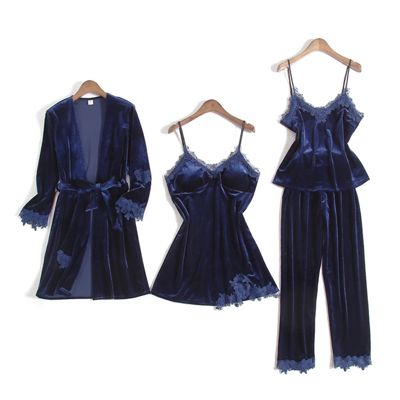 . (40% Rabatt) Kaufen Günstig Gold Samt Pyjamas Für Frauen 4 Stück Winter Anzug Hause Kleidung Frau Sexy Spitze Robe Pyjamas Sets Nachtwäsche Ärmellose Nachtwäsche Preise Online.