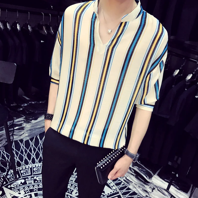. (12% Rabatt) Günstige Kaufen YASUGUOJI Neue 2019 sommer mode kontrast farbe vertikale streifen v ausschnitt half hülse hemd männer chemise homme männer lose kleidung Preise Online.